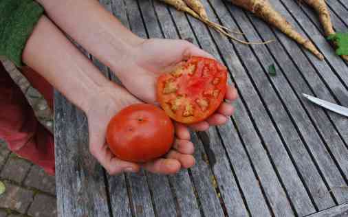 Die Elements-Beach Tomate vom Kleverhof. Robuste, wüchsige Pflanze mit sehr guten Pilzresistenzen. Ein geschützter Anbau, sonnige Hauswand z.B., ist bei dieser Sorte trotzdem wichtig da die Früchte sehr empfindlich sind. Extrem dünne, sandige Haut. Wer keine harte Schale mag, ist bei dieser Sorte genau richtig.