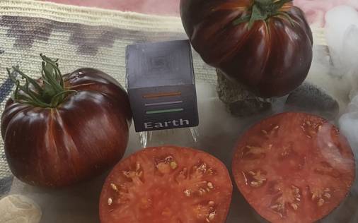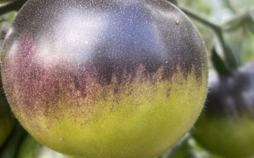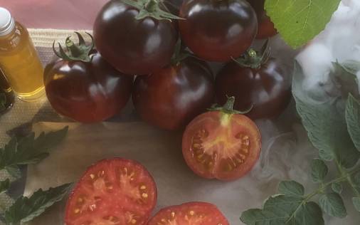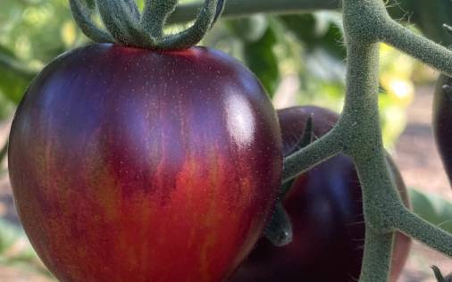 Stark wüchsige Pflanze, krautfäuletolerant. Perfekt für die sonnige Hauswand. Auch im Gewächshaus oder im großen Topf über 20 Liter. Kräftige Pflanze mit gutem Fruchtansatz. Die mittelgroßen, runden Früchte sind schwarz!  Wenn unten ein tiefes Weinrot schimmert, sind sie reif. Innen auch schön dunkelrot mit einem violettem Stich.
