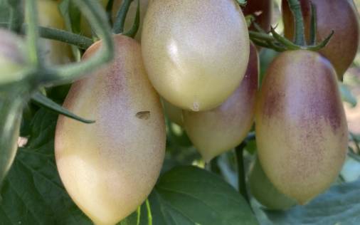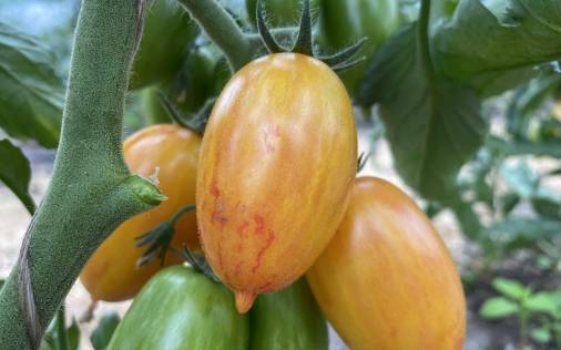 Grünreife Tomaten mit grünen Streifen. Oval- spitz zulaufend, optimale Salattomaten-Grösse. Cremig-weiches, unglaublich zartes Fruchtfleisch. Wenig Säure und doch ein tolles Aroma zeichnet diese Frucht aus.