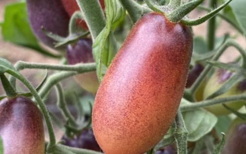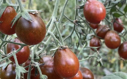 Multiflora Cherrytomate. Extrem guter Ertrag. Die Pflanze braucht viel Platz. Rispen mit 200 bis 500 Tomaten sind keine Seltenheit. Wir empfehlen Töpfe über 20 Liter, besser direkt in die Erde. Reift mittelfrüh. Die ovalen, braunen Cherrytomaten (5 bis 30g) sind dünnschalig und platzen leicht auf. Der Geschmack ist würzig, sehr süss.