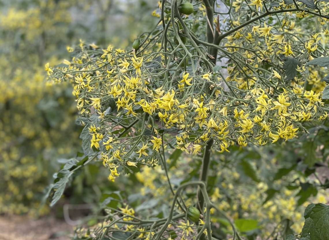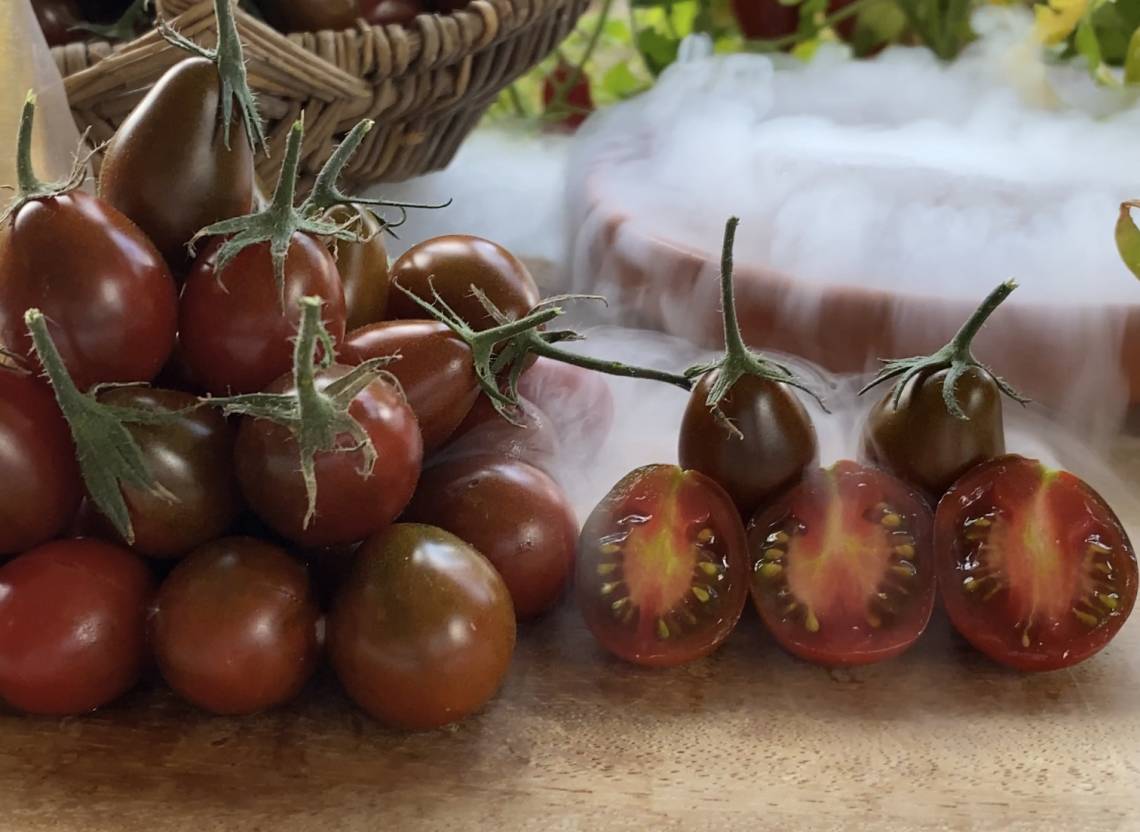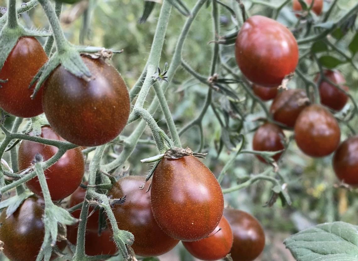 Multiflora Cherrytomate. Extrem guter Ertrag. Die Pflanze braucht viel Platz. Rispen mit 200 bis 500 Tomaten sind keine Seltenheit. Wir empfehlen Töpfe über 20 Liter, besser direkt in die Erde. Reift mittelfrüh. Die ovalen, braunen Cherrytomaten (5 bis 30g) sind dünnschalig und platzen leicht auf. Der Geschmack ist würzig, sehr süss. Die Früchte glänzen und viele bekommen einen dunkelgrünen Kragen. Sie haben eine gute Toleranz gegen Blütenendfäule. Der Pflanzenwuchs ist indeterminierend. Normalblatt (unterbrochen, unpaarig gefiedert)